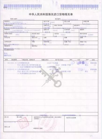 中國(guó)海關(guān)出具的報(bào)關(guān)單產(chǎn)品品名為:生物降解清洗劑