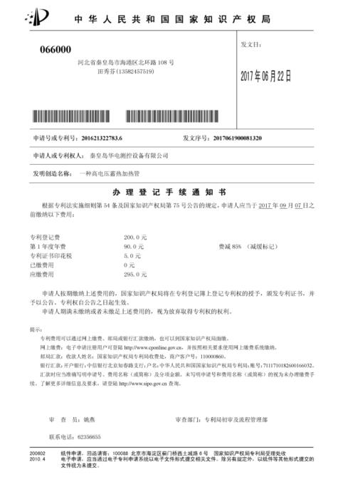 【企業(yè)要聞】喜訊:公司申請(qǐng)的“一種高電壓蓄熱加熱管”專利授權(quán)