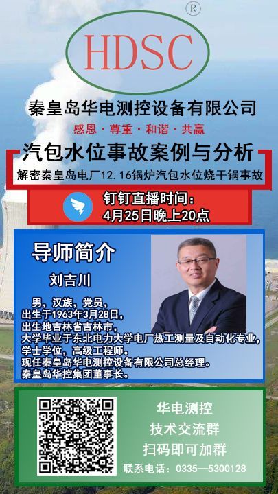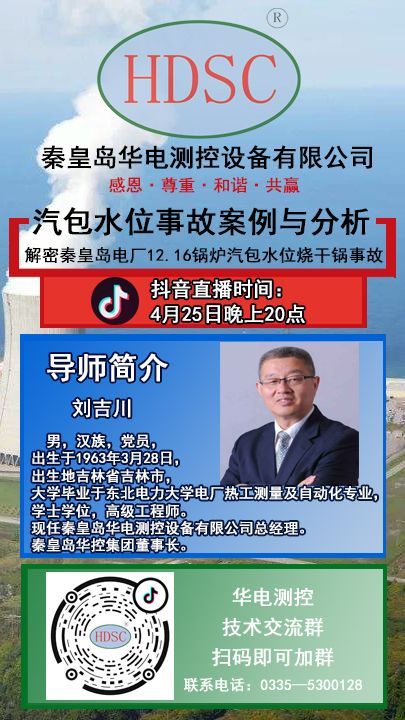 2020年4月25日晚8時(shí),秦皇島華控集團(tuán)有限公司董事長(zhǎng)劉吉川先生攜手【熱控圈】舉辦“火力發(fā)電廠鍋爐汽包水位測(cè)量系統(tǒng)系列講座之解密秦皇島電廠12.16鍋爐汽包燒干鍋事故”?!扒Я摹?、“抖音”、“釘釘”軟件同步直播。