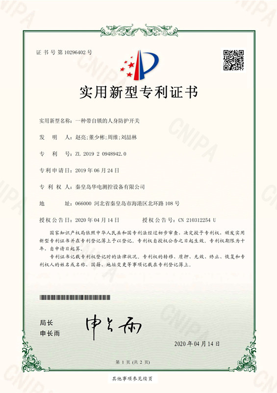 【企業(yè)要聞】公司申請(qǐng)的“一種帶自鎖的人身防護(hù)開關(guān)”獲頒專利證書