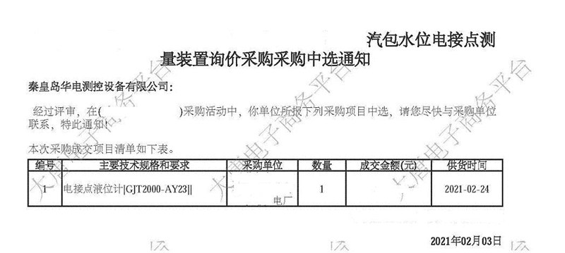 2021年2月3日,我公司在大唐集團(tuán)安徽某電廠的電接點(diǎn)液位計(jì)改造項(xiàng)目的競(jìng)標(biāo)中,憑借強(qiáng)大的綜合實(shí)力以及過(guò)硬的產(chǎn)品質(zhì)量,通過(guò)層層篩選、激烈角逐,以絕對(duì)的優(yōu)勢(shì)順利中標(biāo)。