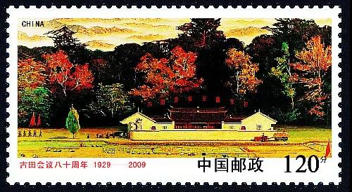 2009年12月28日上午,《古田會議八十周年》紀念郵票首發(fā)式在福建省龍巖市隆重舉行。福建省,中國郵政集團公司的領(lǐng)導(dǎo),以及龍巖市四大班子領(lǐng)導(dǎo)、福建省郵政公司領(lǐng)導(dǎo)和嘉賓出席了郵票首發(fā)式,并為《古田會議八十周年》紀念郵票首發(fā)揭幕?!豆盘飼h八十周年》紀念郵票一套一枚,面值1.2元,郵票圖案為著名畫家王路1972年的作品――《古田會議染層林》油畫。