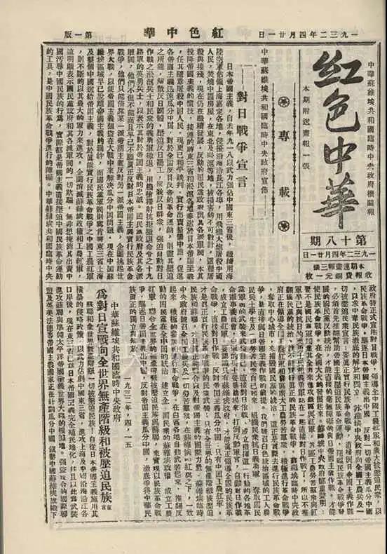 中華蘇維埃共和國(guó)臨時(shí)中央政府宣布對(duì)日戰(zhàn)爭(zhēng)宣言。