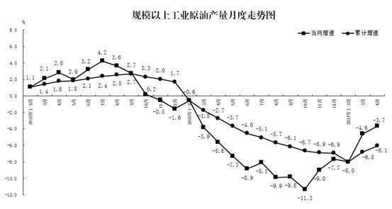 原油生產(chǎn)降幅收窄,進(jìn)口增長較快。4月份,原油產(chǎn)量1599.0萬噸,同比下降3.7%,降幅比3月份收窄0.9個(gè)百分點(diǎn)。1-4月份,原油產(chǎn)量6400.9萬噸,同比下降6.1%。進(jìn)口13912萬噸,同比增長12.5%。
