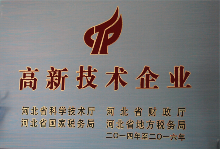 2014年9月19日,公司被河北省科學(xué)技術(shù)廳、河北省財(cái)政廳、河北省國(guó)家稅務(wù)局、河北省地方稅務(wù)局認(rèn)定為河北省高新技術(shù)企業(yè),證書編號(hào):GR201413000387,近日頒發(fā)了證書和牌匾。