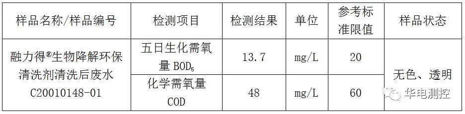 融力得®生物降解環(huán)保清洗劑經(jīng)英格爾檢測(cè)技術(shù)服務(wù)(上海)有限公司檢驗(yàn),生化需氧量為13.7 mg/L,遠(yuǎn)遠(yuǎn)高于中國(guó)國(guó)家環(huán)保標(biāo)準(zhǔn)要求,可以通過(guò)工廠現(xiàn)有污水處理系統(tǒng)進(jìn)行排放。
