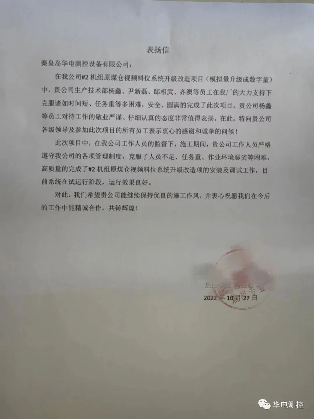 客戶對我們產(chǎn)品和服務的認可,便是我們最大的收獲和動力。秦皇島華電測控設備有限公司一直以來秉承著“以坦誠交朋友,以創(chuàng)新謀發(fā)展,以質量求生存,以服務贏信譽,以改進拓市場”的企業(yè)經(jīng)營方針,急用戶之所急、產(chǎn)用戶之所需,為電廠安全運行保駕護航。