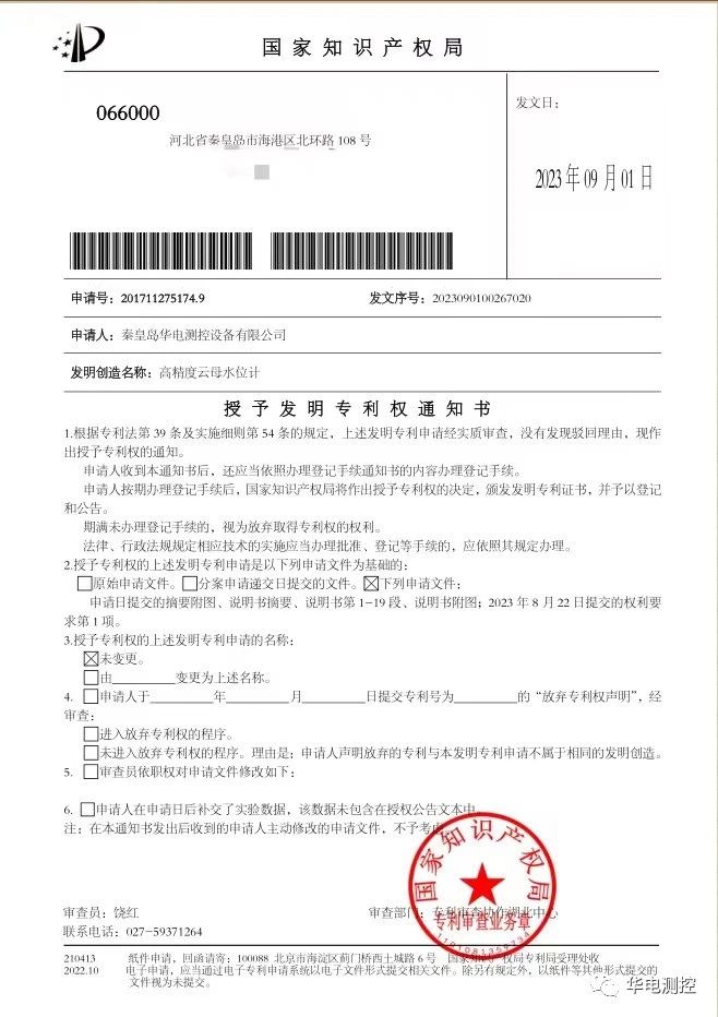 2023年9月1日,秦皇島華電測(cè)控設(shè)備有限公司自主研發(fā)的“高精度云母水位計(jì)”喜獲國家發(fā)明專利!