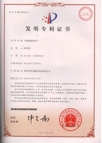【企業(yè)要聞】喜訊:公司申請的“內(nèi)裝磁致液位計”獲頒發(fā)明專利證書