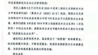 近日,秦皇島華電測控設(shè)備有限公司收到了全國高新技術(shù)企業(yè)認(rèn)定管理工作領(lǐng)導(dǎo)小組辦公室下發(fā)的《關(guān)于河北省2020年第三批高新技術(shù)企業(yè)備案的復(fù)函》(國科火字〔2020〕243號〕文件,公司第六次順利通過高新技術(shù)企業(yè)認(rèn)定More