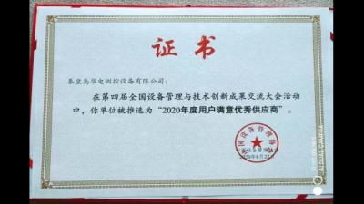 【企業(yè)動(dòng)態(tài)】您的滿意,我們的動(dòng)力!” 2020-09-282020年8月22日,秦皇島華電測(cè)控設(shè)備有限公司應(yīng)中國(guó)設(shè)備管理協(xié)會(huì)邀請(qǐng),參加2020年第四屆全國(guó)設(shè)備管理與技術(shù)創(chuàng)新成果交流大會(huì)。并被推薦為“2020年度用戶滿意優(yōu)秀供應(yīng)商”。 (華電測(cè)控獲獎(jiǎng)證書(shū))(華電測(cè)控獲得2020年度用More