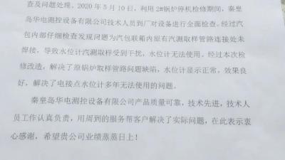 2020年5月15日,華電測控收到來自新疆某化工有限公司的表揚(yáng)信,表揚(yáng)我公司解決了該廠鍋爐汽包電接點(diǎn)水位計多年無法使用的問題。信中對我公司的產(chǎn)品質(zhì)量、全新全意為客戶服務(wù)的理念以及技術(shù)人員認(rèn)真負(fù)責(zé)的工More