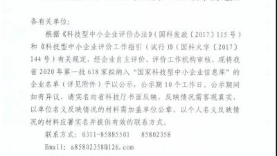 近日,河北省科技廳根據(jù)《科技型中小企業(yè)評(píng)價(jià)辦法》(國(guó)科發(fā)政【2017】115號(hào))、《科技型中小企業(yè)評(píng)價(jià)辦法工作指引(試行)》(國(guó)科火字【2017】144號(hào))要求,公示通過(guò)河北省2020年第一批“科技型中小企業(yè)”名單。我公司憑借在企業(yè)More