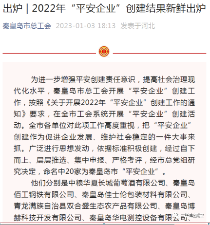 2022年,為進(jìn)一步增強(qiáng)企業(yè)安全生產(chǎn)主體責(zé)任和全員安全責(zé)任意識(shí),有效提升企業(yè)安全管理水平,秦皇島華電測(cè)控設(shè)備有限公司響應(yīng)秦皇島總工會(huì)開展的“平安企業(yè)”創(chuàng)建工作,按照《關(guān)于開展2022年“平安企業(yè)”創(chuàng)建工作的通知》要求,打造高標(biāo)準(zhǔn)“平安企業(yè)”。經(jīng)過(guò)嚴(yán)格考評(píng),秦皇島華電測(cè)控設(shè)備有限公司被秦皇島市總工會(huì)命名為2022年秦皇島市“平安企業(yè)”。More